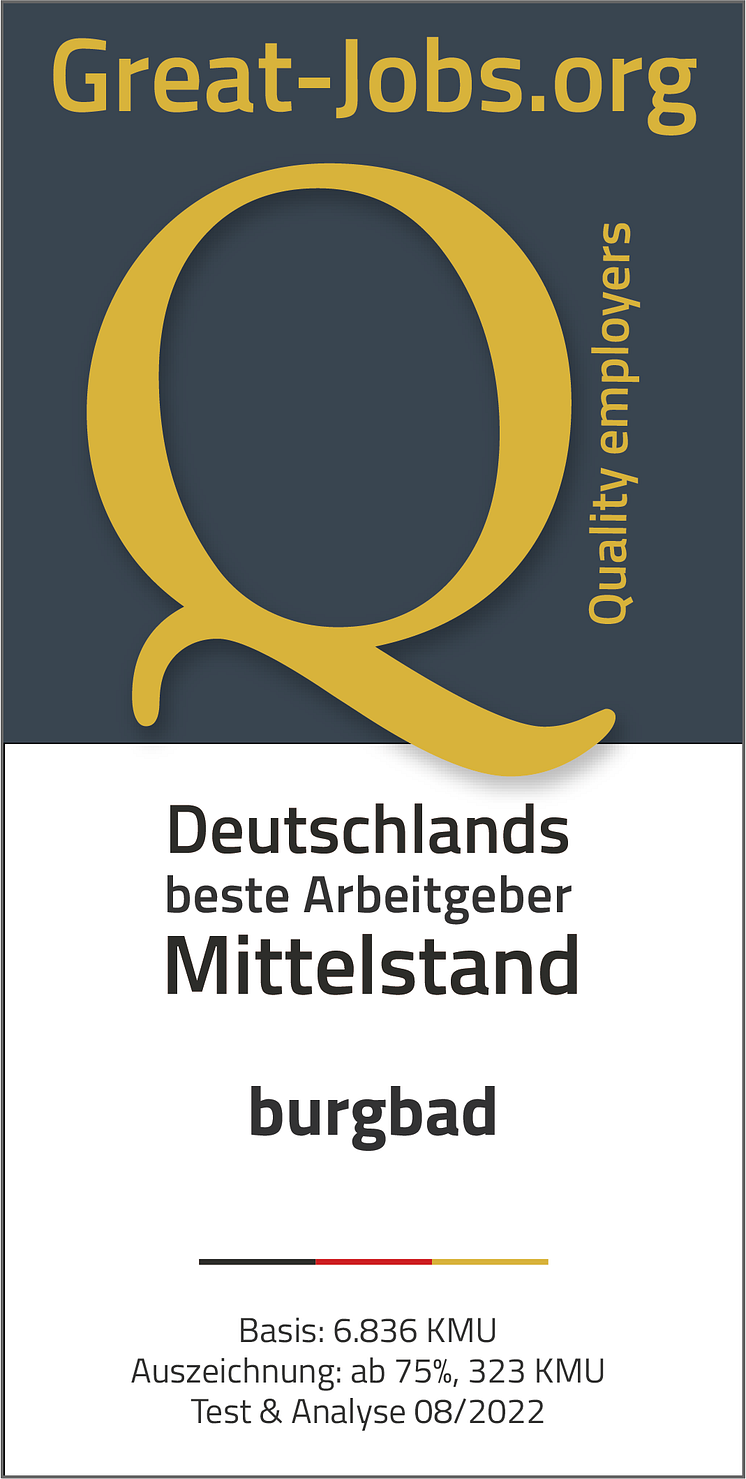 burgbad erhielt das Great Jobs-Arbeitgebersiegel 2022 als einer der besten Arbeitgeber des deutschen Mittelstands. Nur 4,7 Prozent (323 von insgesamt 6.836) der kleinen und mittleren Unternehmen im Test 08/2022 erfüllten die hohen Anforderungen für diese Bestnote. Arbeitgebersiegel sollen Arbeitsuchenden oder wechselwilligen Arbeitnehmern und Arbeitnehmerinnen bei der Suche nach ihrem Traumjob helfen.