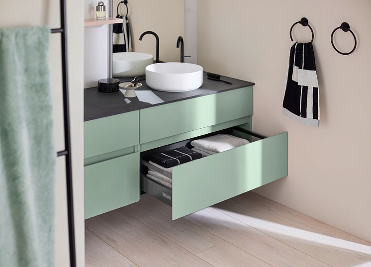 Durchgängig horizontaler, aufgeräumter Look: Das Systemlinien-Programm sys30 von burgbad, das maßflexible und umfangreichste All-in-One-Badplanungstool am Markt, verfügt über eine Frontvariante in griffloser Optik mit verdeckten, Front-breiten Griffmulden. Zu der neuen Feinsteinzeug-Konsolenplatte (hier in Feinstein Nachtschwarz) bilden die Lackfronten Salbeigrau Solid Matt einen reizvollen Kontrast. Alle Elemente sind maßflexibel zu ordern. Foto: burgbad