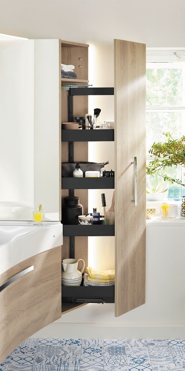 Der besondere Clou bei der neuen Sys30 Ecklösung ist der Apothekerschrank mit viel komfortablem Stauraum für die Ecke. (Foto: burgbad)