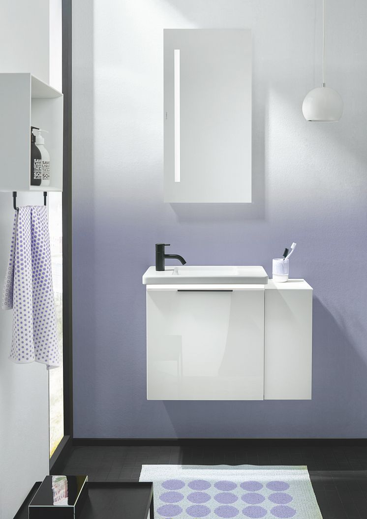 Mit der neuen Gästebadlösung wird Eqio endgültig zum Komplett-Programm für alle Fälle. Der Waschtisch ist wie das übrige Programm in den Materialien Glas, Keramik und Mineralguss erhältlich und optional mit einer unter dem Beckenrand integrierten, umlaufenden LED-Beleuchtung ausgestattet.