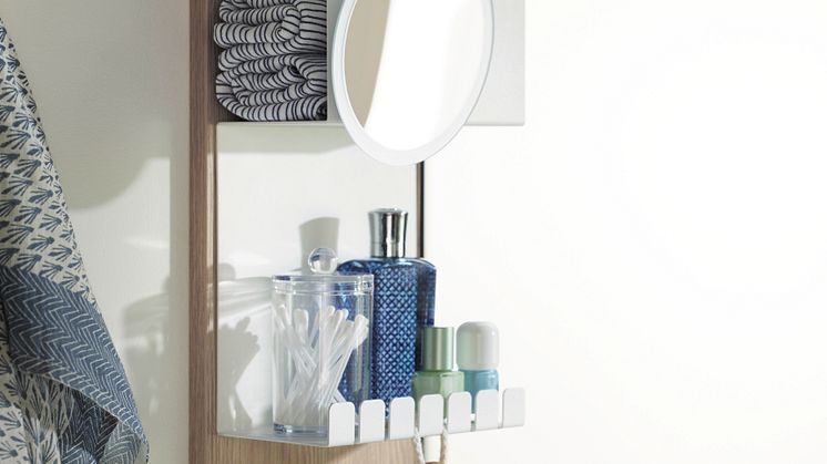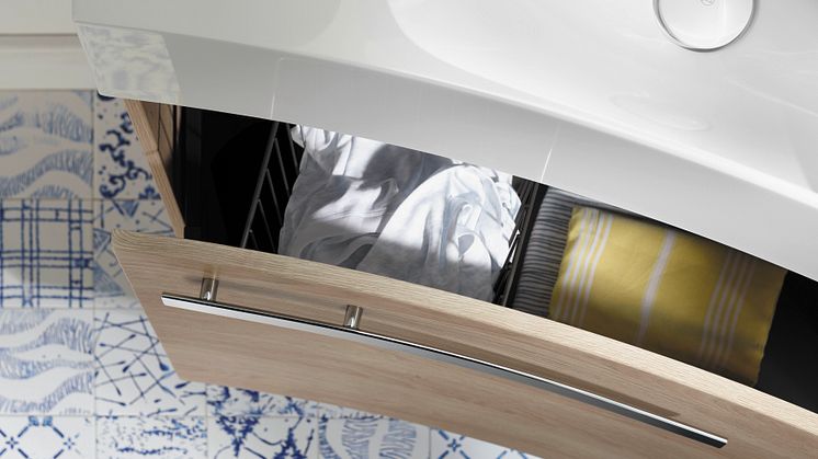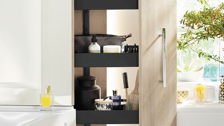 Der Waschtischunterschrank verfügt über eine innen liegende Steckdose und einen als Handtuchreling dienenden Griff, und der Auszug verbirgt einen vielseitig nutzbaren und leicht entnehmbaren Utensilienkorb für Wäsche, Handtücher, Putzmittel oder Abfall. Alle weiteren Bad-Utensilien sind in dem Apothekerschrank gut zugänglich untergebracht: in vier Aufbewahrungsboxen, die per Auszug auf Augenhöhe hervorgezogen und dank Selbsteinzug und Dämpfung ebenso bequem wieder in die Ecke geschoben werden können.