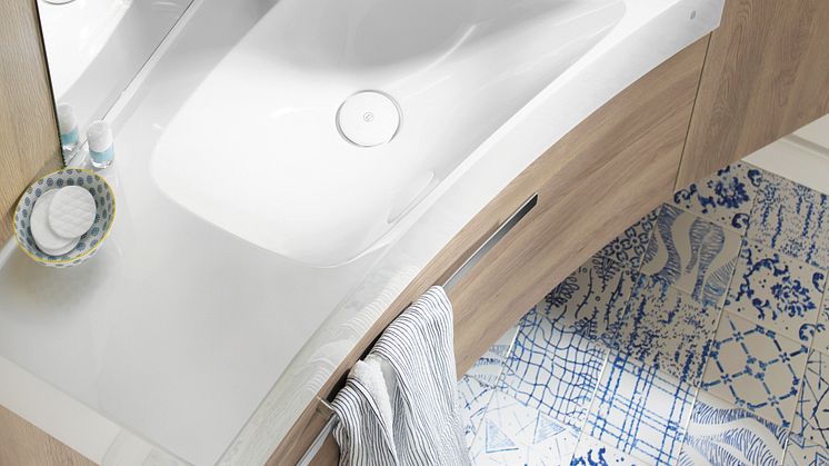 Der aus Mineralguss gefertigte Waschtisch selbst – wählbar in den Farben Weiß Brilliant und Weiß Velvet – bietet trotz großzügiger Kumme eine angenehm breite Ablagefläche. Innovative Details wie der unsichtbar in der Waschtischschürze integrierte und damit vor Schmutz geschützte Sensorschalter für die Beleuchtung oder der zu den Wänden leicht hochgezogene Rand, der eine Silikonnaht zum Spiegel überflüssig macht, sprechen für das durchdachte und hygienische Designkonzept des Waschtisches.